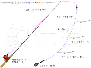 仕掛け図ではスッテを3本付けていますが、イカの乗りが良い時は2本にします。