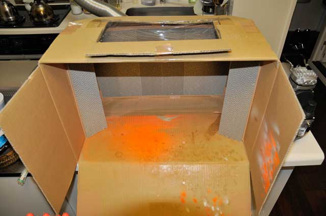 ブース、(つうかダンボールだけど(笑))の上側に、明り取りのために穴を開け、最初は透明のアクリル板を取り付ける予定だったんだけど、買いに行くのが面倒・・・いやいや、どうせ塗料が付いて見えなくなってしまうので、サランラップをビニールテープで隙間が無いように貼り付けました(笑)